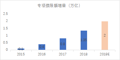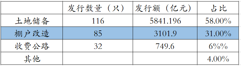 做一个简单测算模型,从需求端来看,棚改资金主要取决于棚改项目的落地进度,根据2018-2020年将改造各类棚户区1500万套,2018年完成580万套以上,初步预计2019年改造460万套,按照开工套数和投资规模测算,明年棚改项目投资近 1.3万亿元,则政策行和专项债两项需要覆盖90%即为1.17万亿。供给端分析,专项债积极政策支持下,结合往年专项债限额变动趋势,预计2019年地方政府专项债限额保底新增2万亿,考虑到存量专项债的发行结构中土储、棚改、收费公路三者比例构成(6:3:1;如图9),预计2019年棚改专项债将会新增6000亿的额度。供需两端相结合,政府购买模式取消,仅依靠专项债融资,预计2019年棚改项目资金缺口会达到6000亿元。