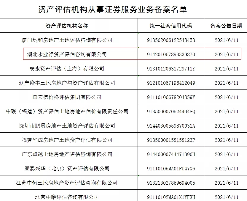 2021年6月11日,中国证券监督管理委员会官网公布“从事证券服务业务资产评估机构备案名单及基本信息”,湖北永业行资产评估咨询有限公司位列其中,标志着永业行完成证券服务业务资产评估机构资质备案。