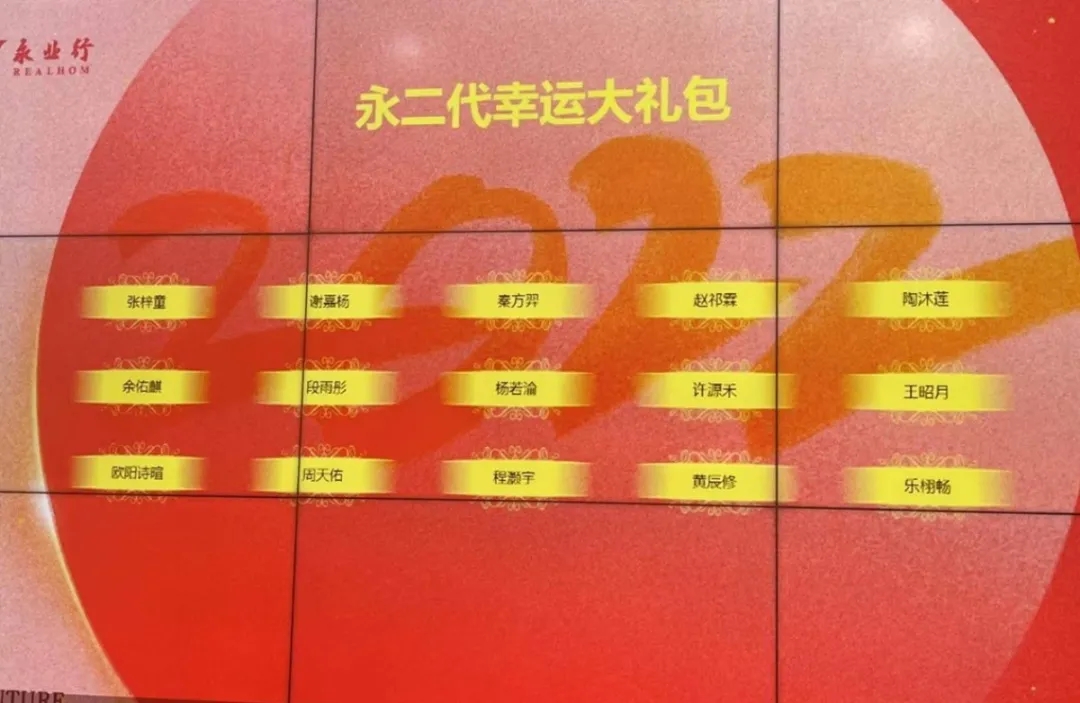 “永二代”代表着关爱、传承与希望。永业行一直以来十分重视和关爱每一位员工的家庭幸福生活,特别是“永二代”的成长情况。联欢活动中,董事长潘世炳抽取了“永二代”幸运大礼包,为100名永业行宝宝们送上了新年的祝福。伴随着永二代幸运大礼包得主们的诞生,“永二代”活动室建设方案也正式启动。