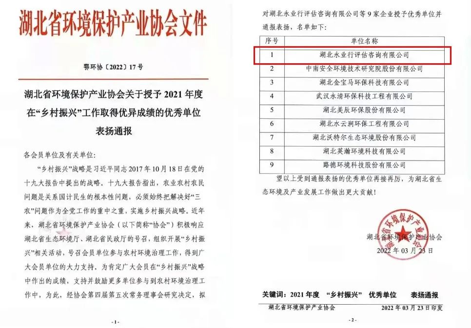 2022年3月23日,湖北省环境保护产业协会发布表扬通报,永业行获表彰为2021年度“乡村振兴”优秀单位。