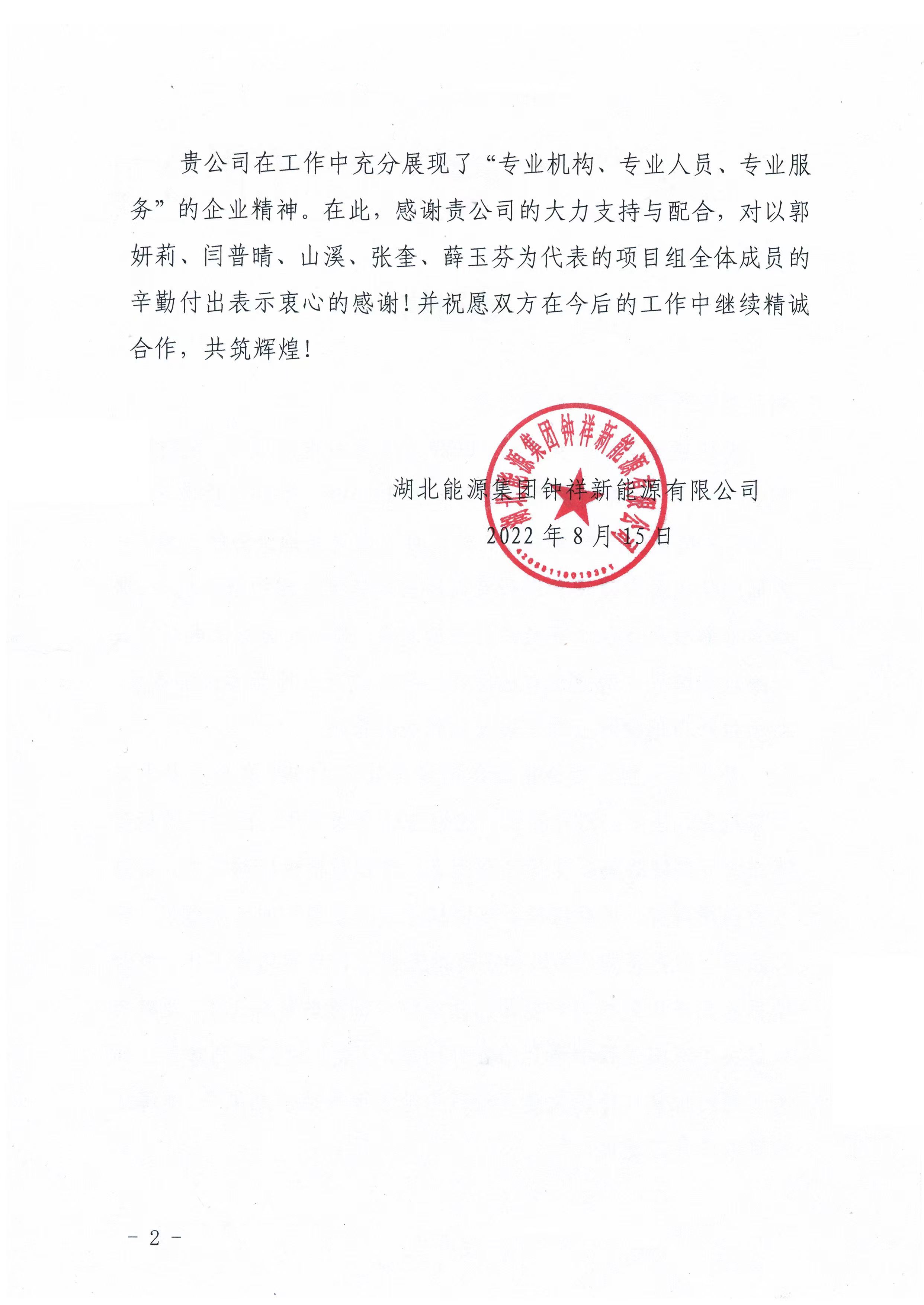 2022年8月16日,湖北能源集团钟祥新能源有限公司致函永业行,对我司承担的钟祥双河100MW农光互补电站项目地灾、压矿、用地预审、规划选址专题工作给予肯定和感谢。