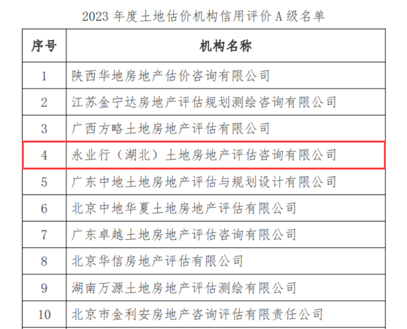 全国第四,湖北第一!永业行再获“土地估价机构信用评价A级资信”称号